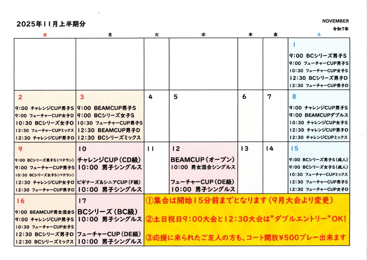2025年11月の【平日】大会日程を掲載しました!